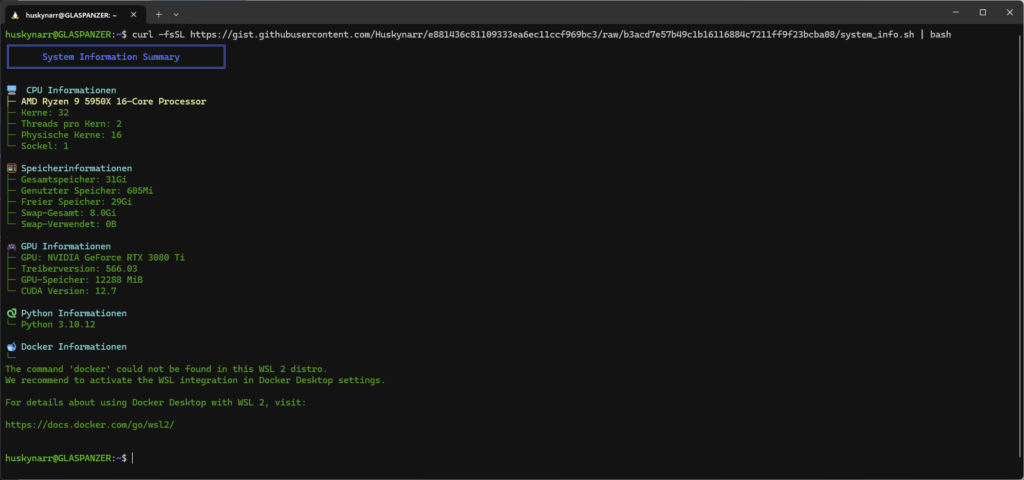 Dieses Skript bietet eine umfassende Übersicht über die Hardware- und Software-Spezifikationen des Systems und kann einfach angepasst und ausgeführt werden, um die relevanten Informationen schnell zu erfassen.